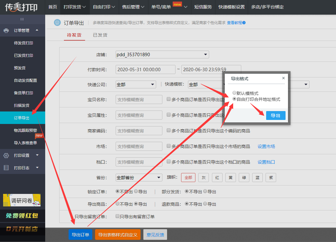 3、依次点击进入:【左侧-导出订单】 -> 【顶部-导出订单】 -> 【重要:自由打印合并地址格式】 -> 导出成功。